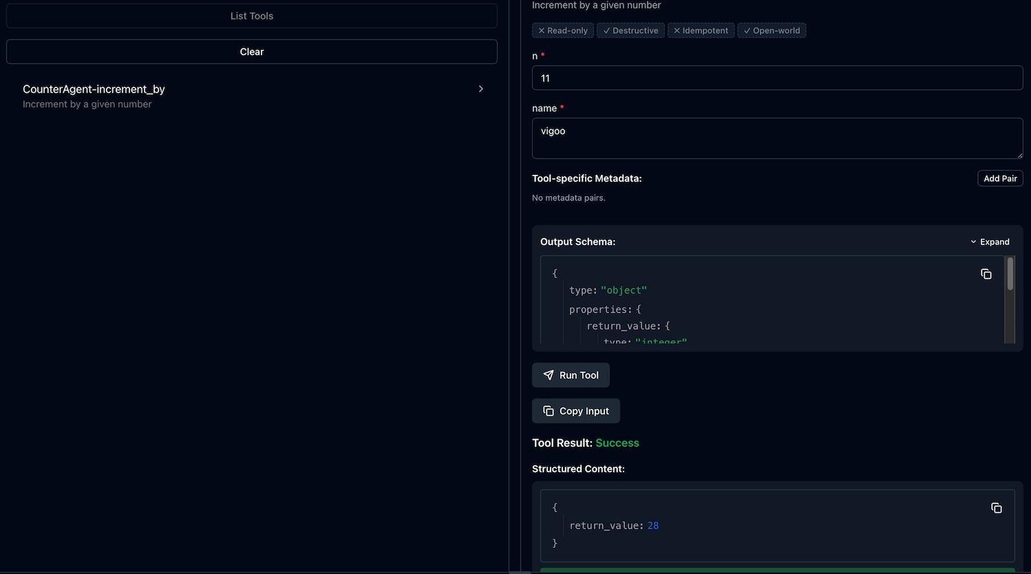We can pass the Counter agent's constructor parameter, name and the increment_by method's n parameter, and invoke it through an MCP tool.