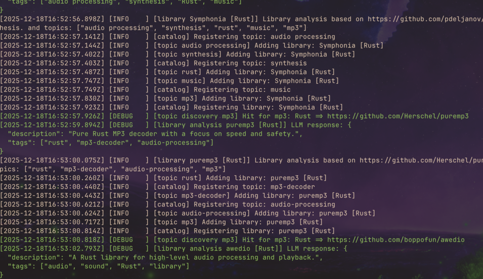 Our application is going to be a graph database of libraries for various programming languages, organized into topics. By selecting a topic (let's say json) we will be able to discover libraries (Rust and JavaScript libraries) that associated with that topic - then all hits are going to be analyzed and stored. Each analyzed library is going to also add new topics, and these topics can be used to do more search for libraries, and so on.