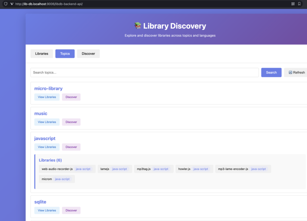 We can add more endpoints to get details of a library or trigger discovery of a topic, etc. Once we've done with all that, simply running golem deploy again will make these endpoints available on the chosen deployment. For locally running Golem server, that's by default is http://lib-db.localhost:9006 for this example.